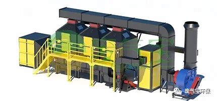 活性炭吸附浓缩-脱附设备是由3个活性炭单元吸附器组成,以时间为顺序,依次完成每个活性炭吸附单元的吸附、脱附和冷却过程,进而把大风量、低浓度的有机废气浓缩成小流量、高浓度的有机废气净化设备。浓缩后的高浓度气体连接到催化燃烧设备进行氧化处理。